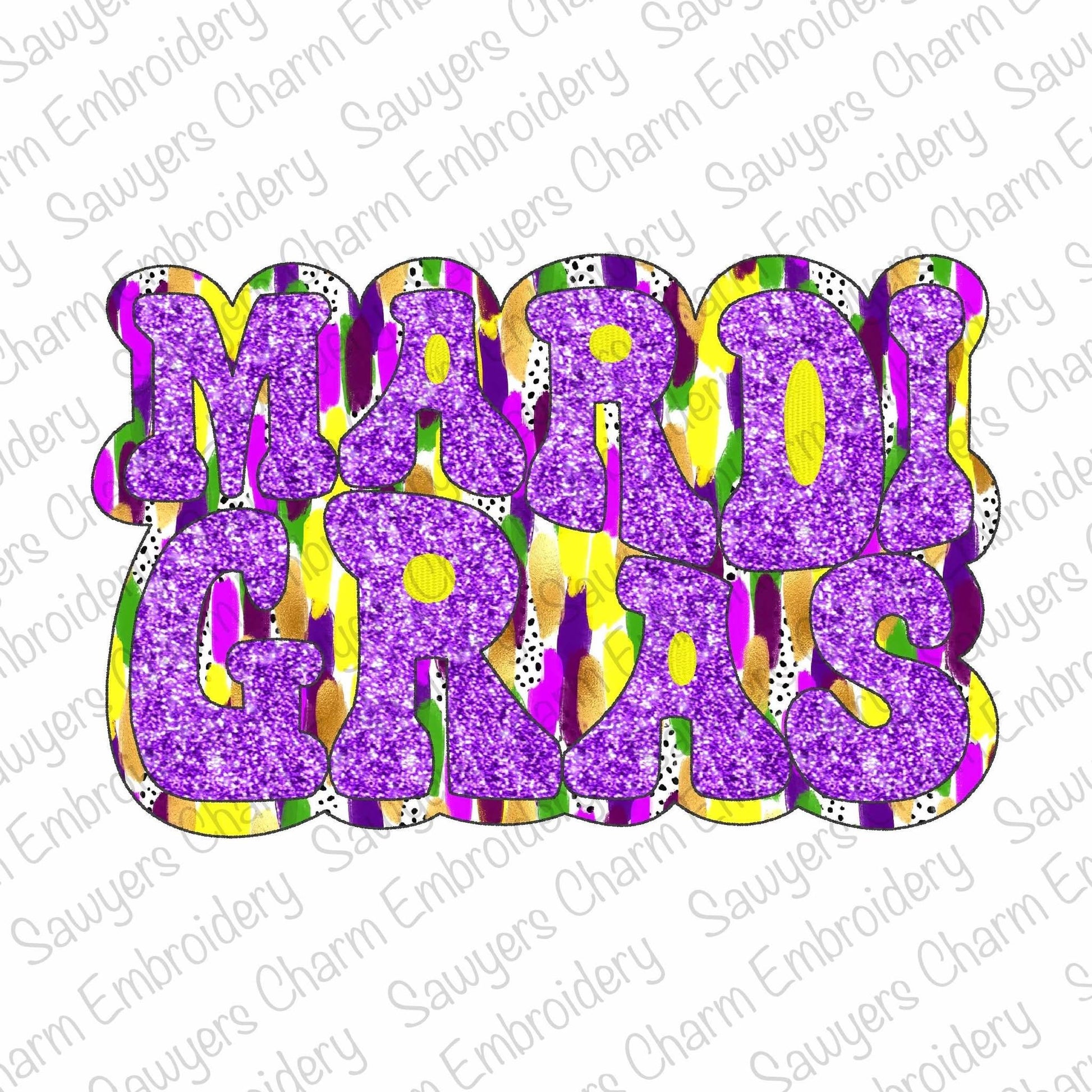 This embroidery file comes in several sizes....5 inches wide, 6 inches wide, 5x7, 8 inches wide, 9 inches wide, and 10 inches wide. This is a bean stitch applique. It only requires two pieces of fabric, one for the underlay, and then one for the words Mardi Gras. Such a quick stitch!