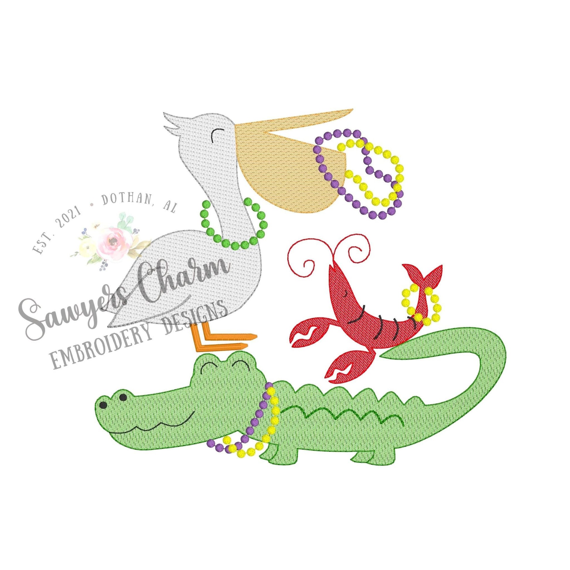 Mardi Gras stacked animals & beads sketch stitch machine embroidery design file, quick stitch, alligator, crawfish, pelican, beans stitch