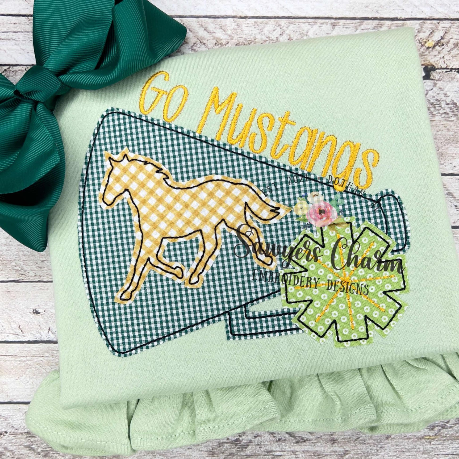 Megaphone & pompom horse mascot silhouette, bean stitch applique, machine embroidery design, college, high school sports, university, cheer
