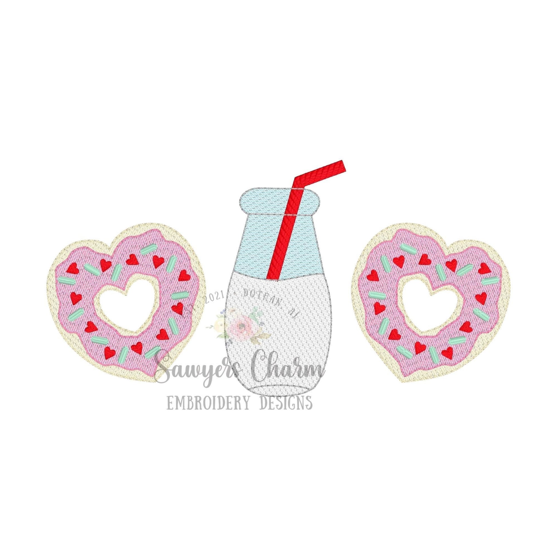Milk & heart donuts with sprinkles trio sketch stitch machine embroidery file, Valentine's Day, love, XOXO, hugs and kisses, snacks