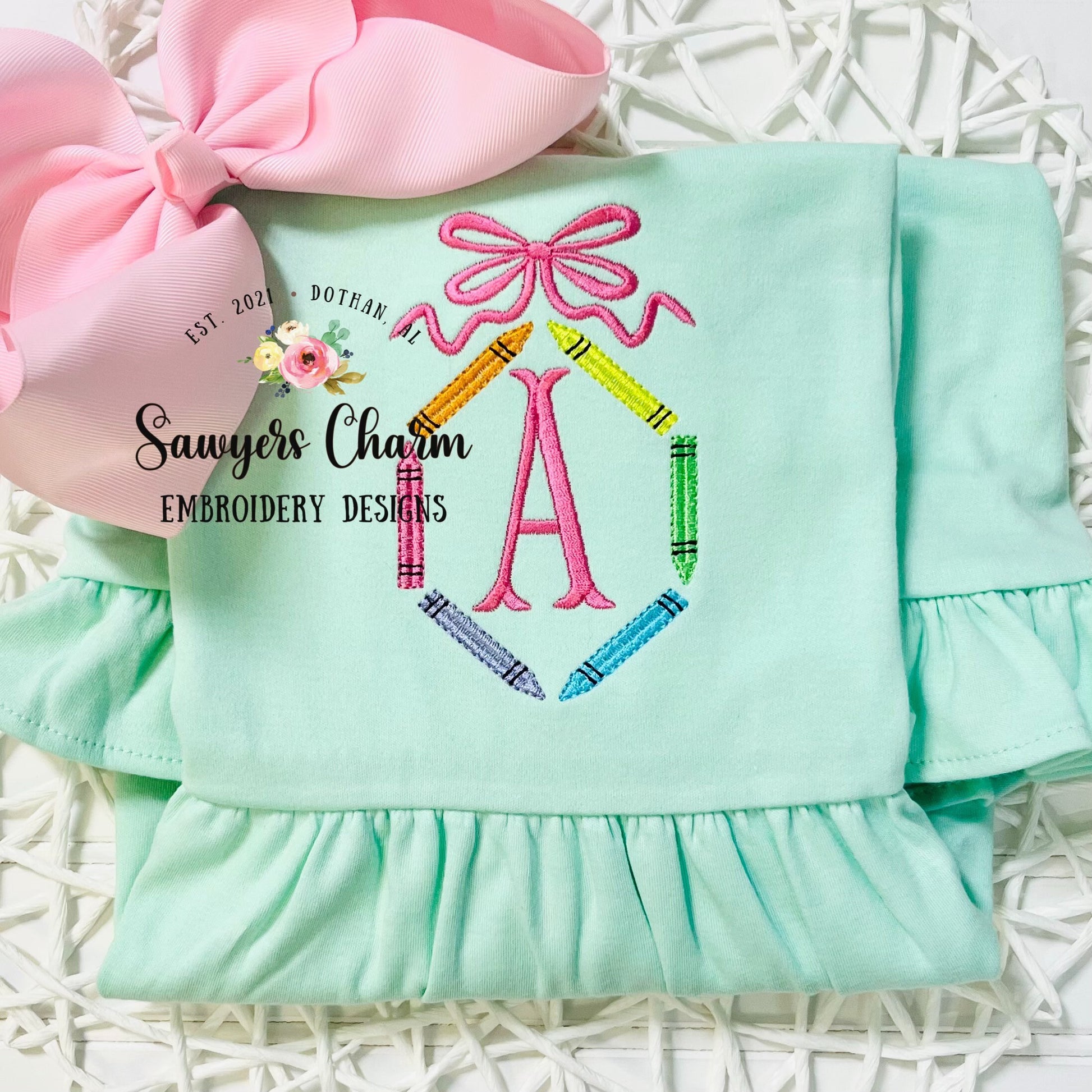 Mini fill crayons with bow monogram frame machine embroidery design file, quick stitch, perfect for monograms, satin, colors, back to school