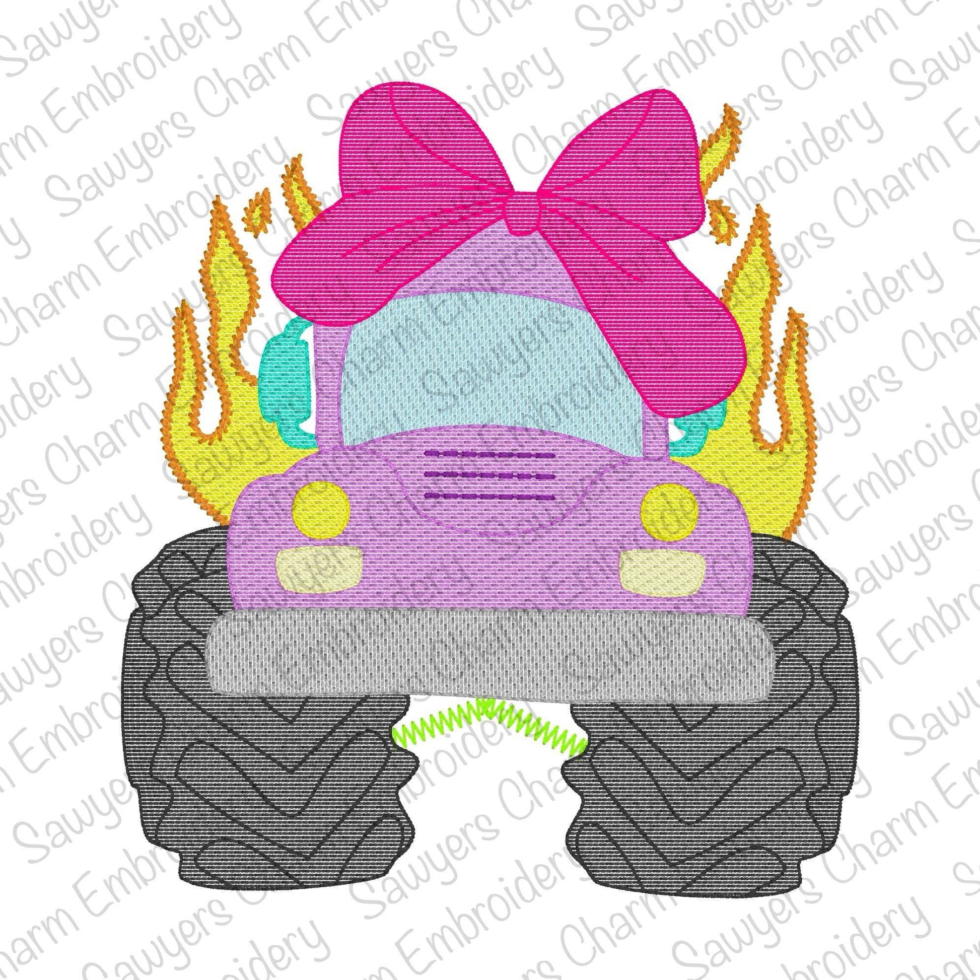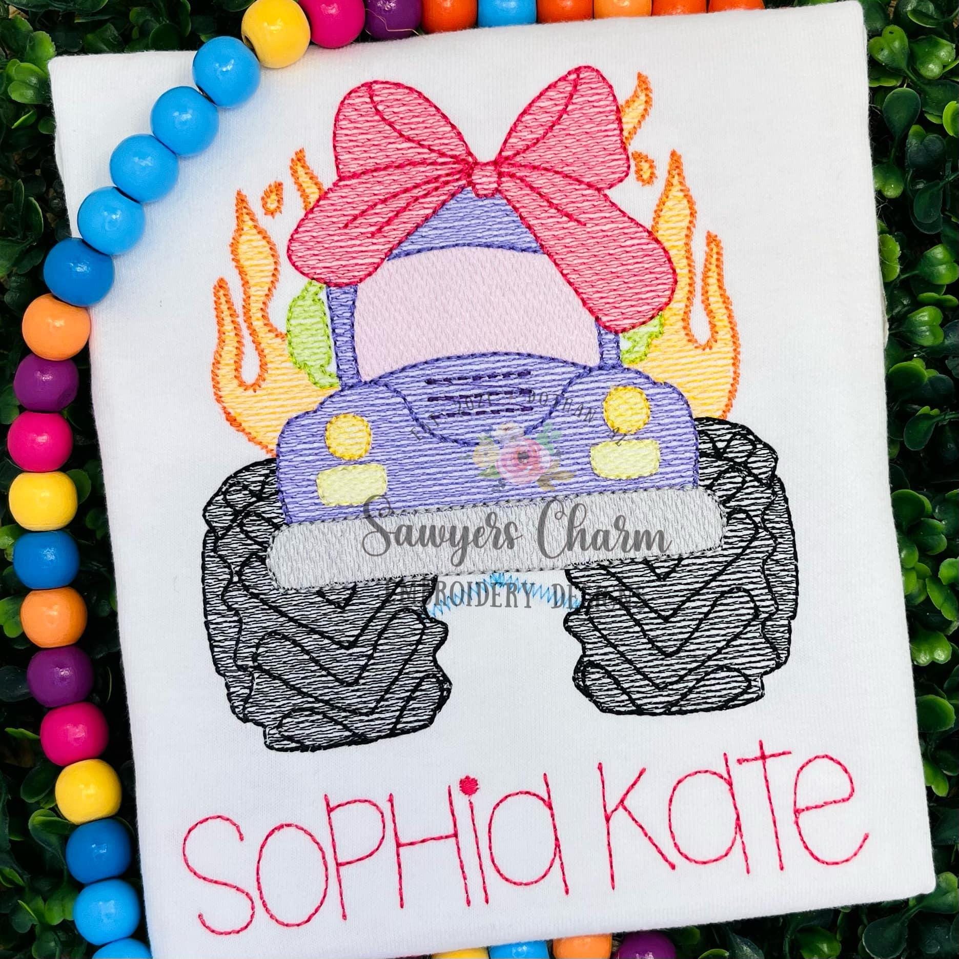 Monster truck with coquette bow & fire sketch stitch machine embroidery design, mudding, rally, off roading, vehicle transportation, racing
