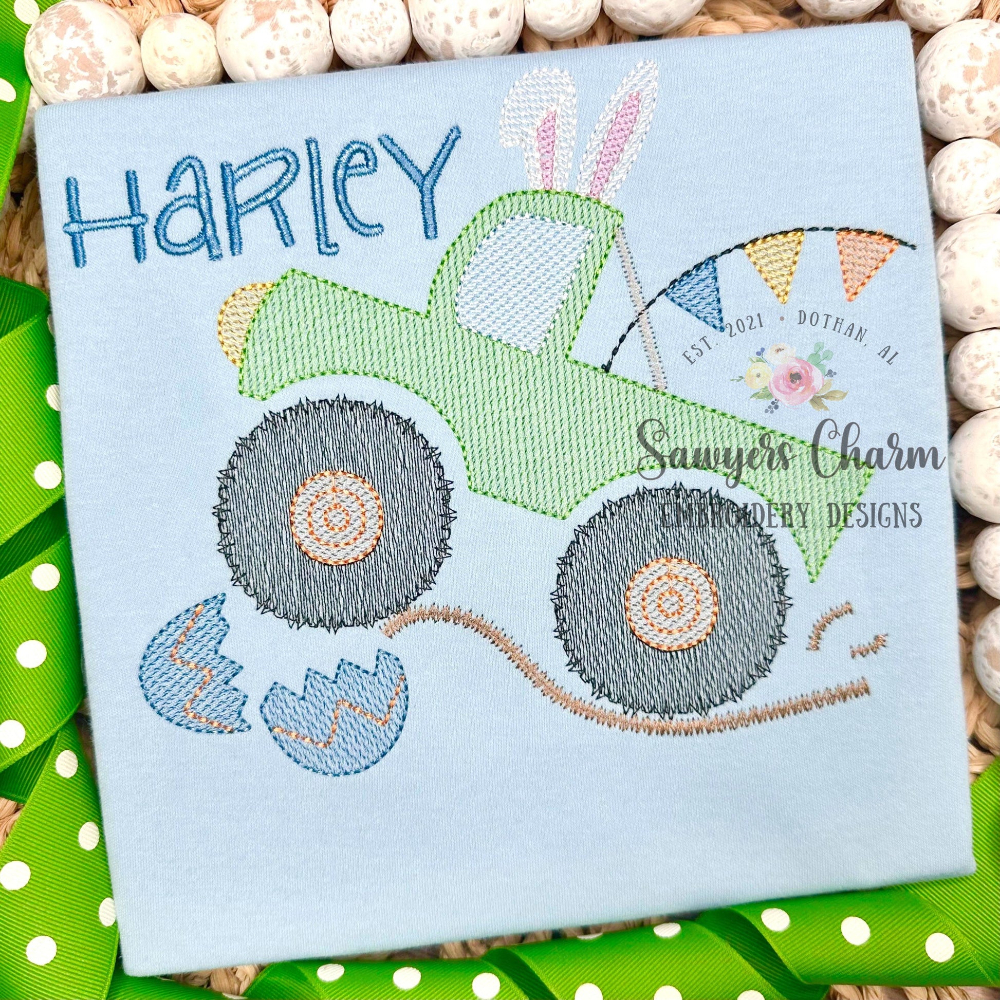 Monster truck with flags & bunny ears and eggs sketch stitch, machine embroidery design file, bean stitch, mudding, dirt, rally, Easter egg
