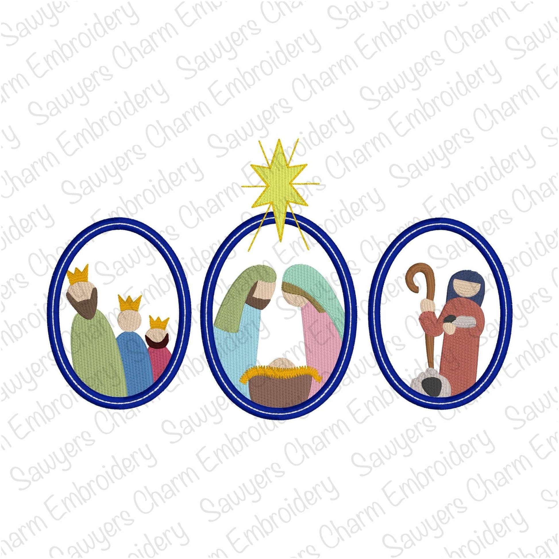 Nativity scene with Bethlehem star oval frame trio, fill stitch machine embroidery design, holidays, Merry Christmas, Baby Jesus, wisemen