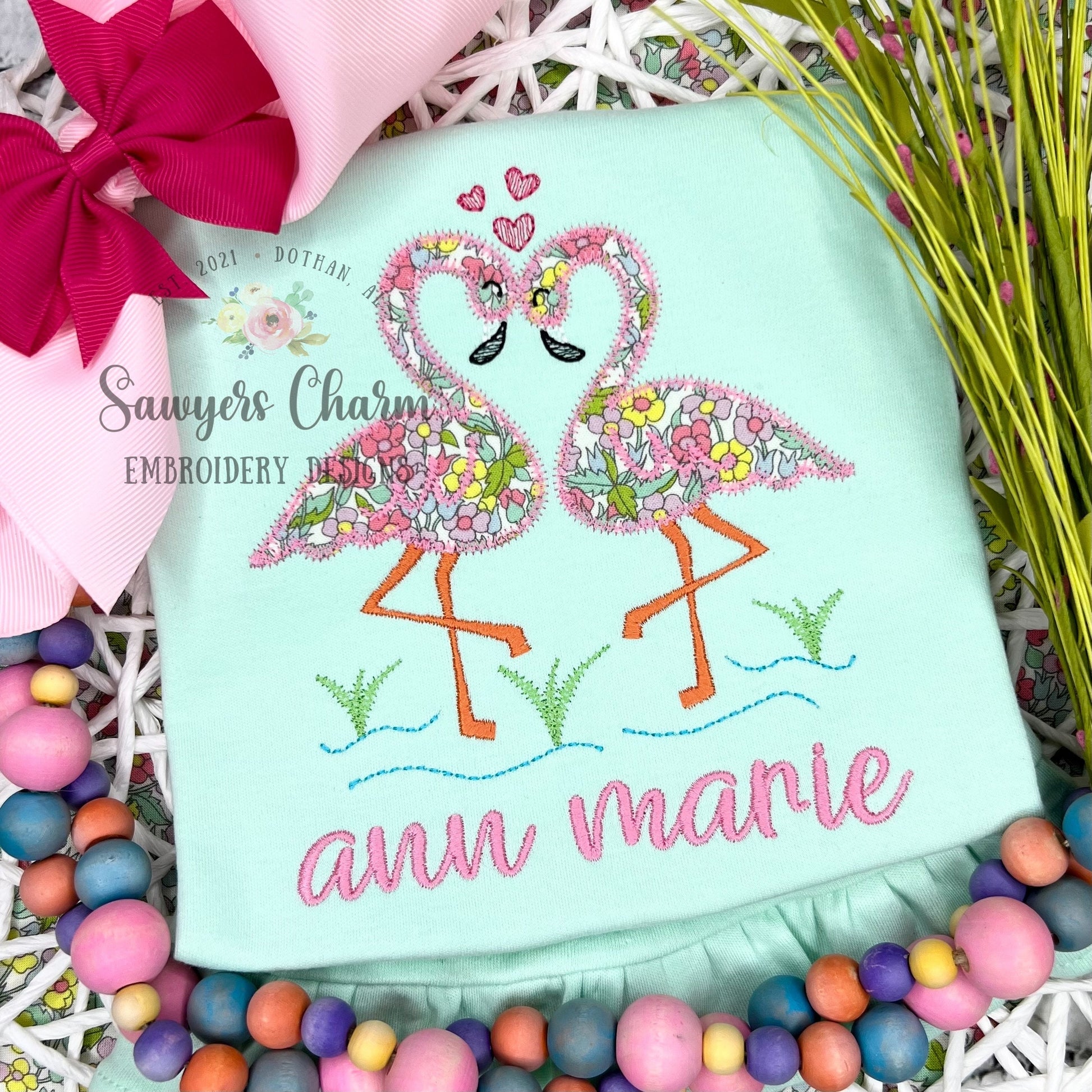Pair of flamingos with hearts zig zag stitch machine applique, embroidery design file, love birds, water, zoo, quick stitch, xoxo, valentine