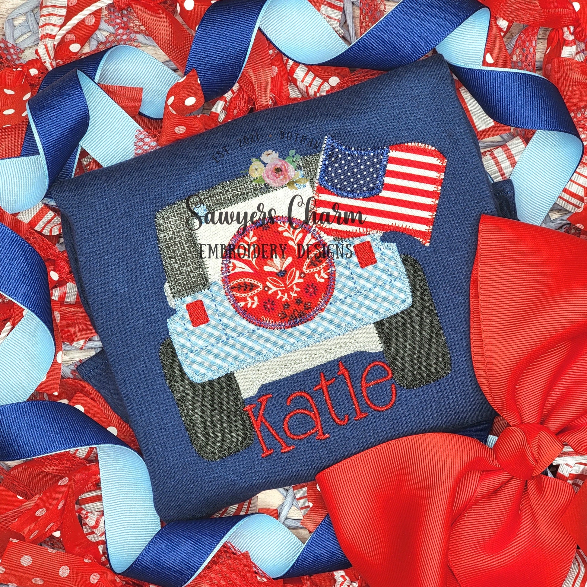 Patriotic Off Road vehicle truck with American flag zigzag stitch applique, machine embroidery design file, transportation mudding, SUV, USA