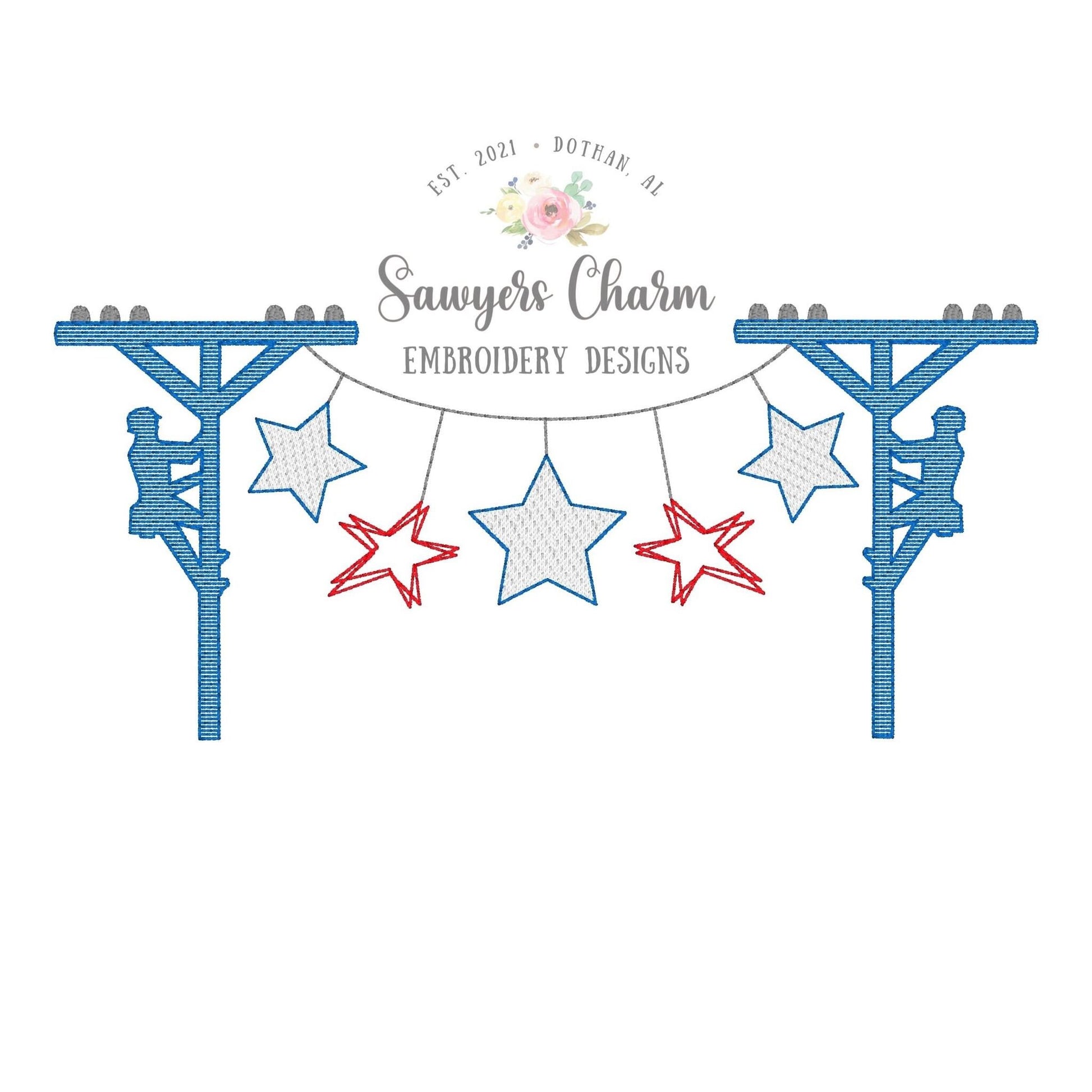 Patriotic stars lineman bunting banner, sketch stitch machine embroidery design file, quick stitch, summer, July 4th, Memorial Day