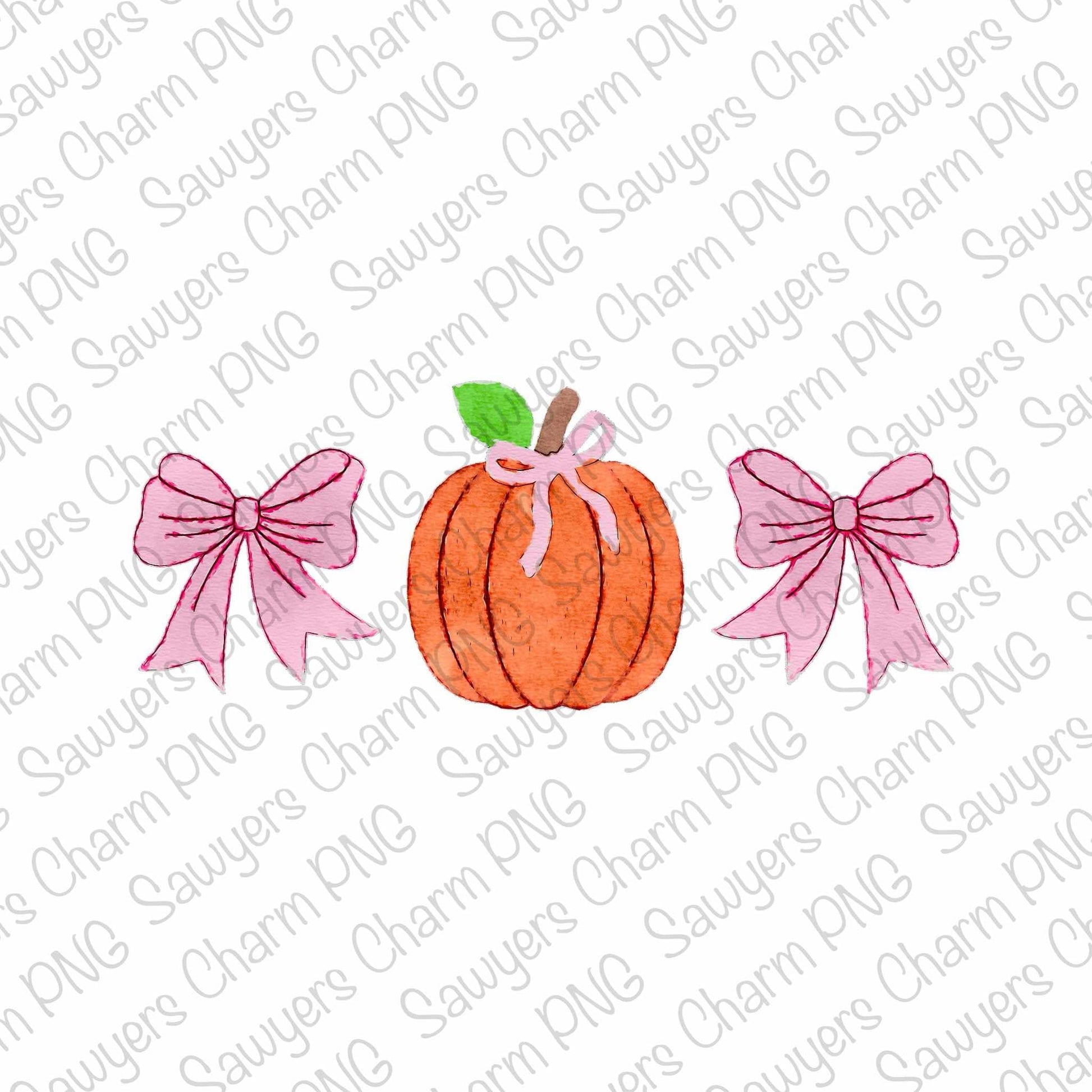 PNG watercolor Pumpkin & coquette bows trio Printable file/Sublimation/Heat Transfer Design/Digital Clipart, Fall, trendy grand millennial