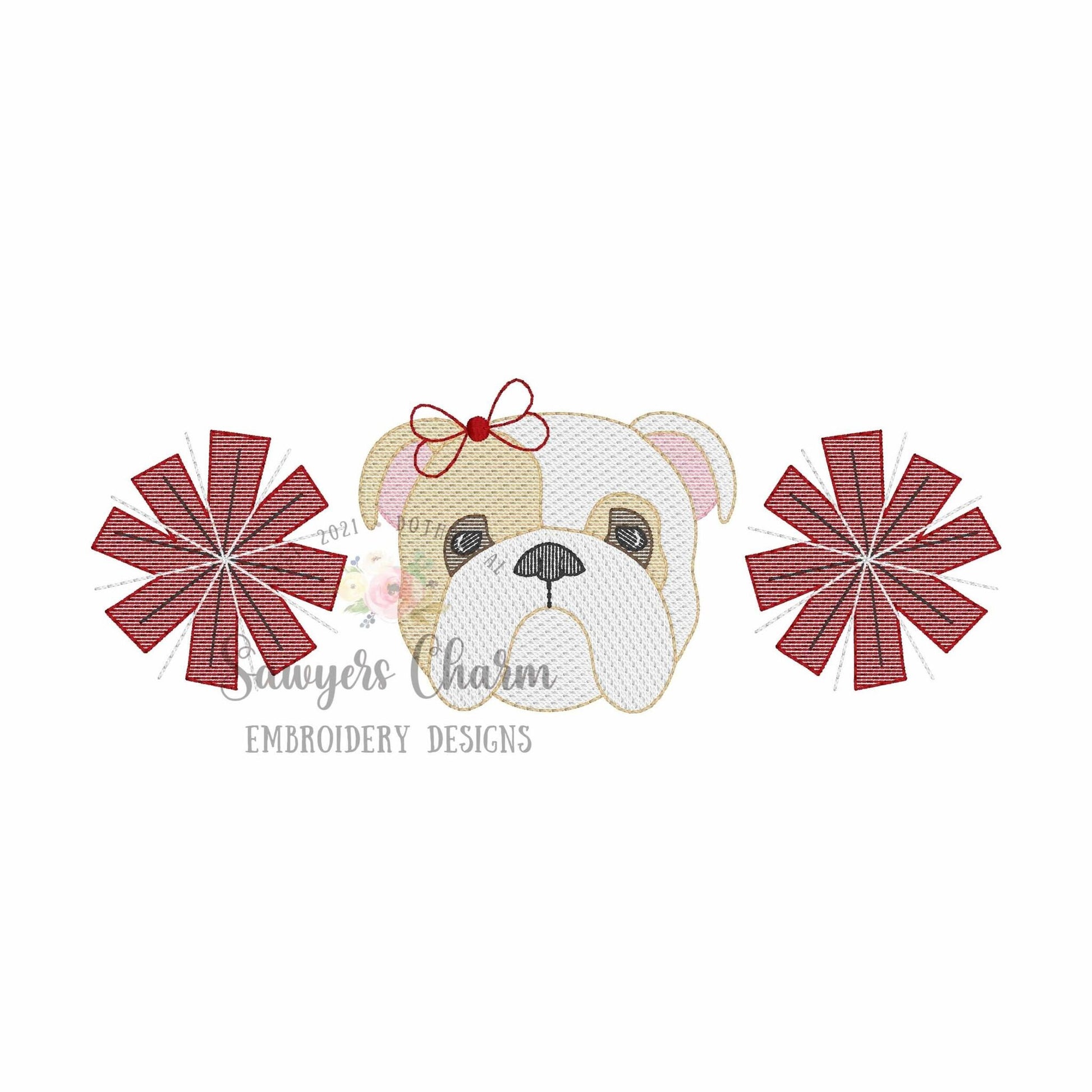 Pom poms, two color bulldog with bow trio, sketch stitch embroidery design, college university, football cheerleader, cheerleading, coquette