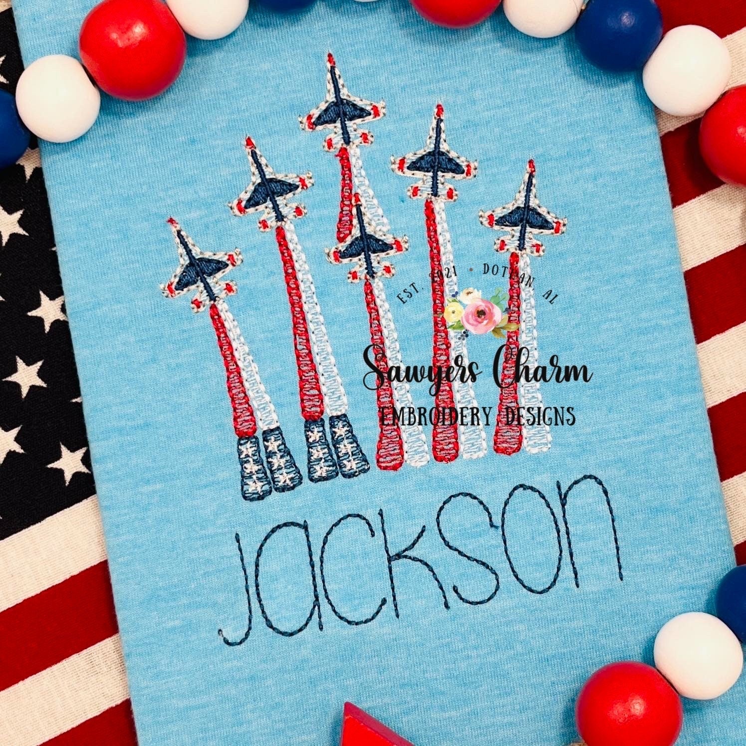 Red/white/blue jets, stars/stripes, flag smoke sketch stitch machine embroidery design file, July 4th, patriotic, summer, America, air show