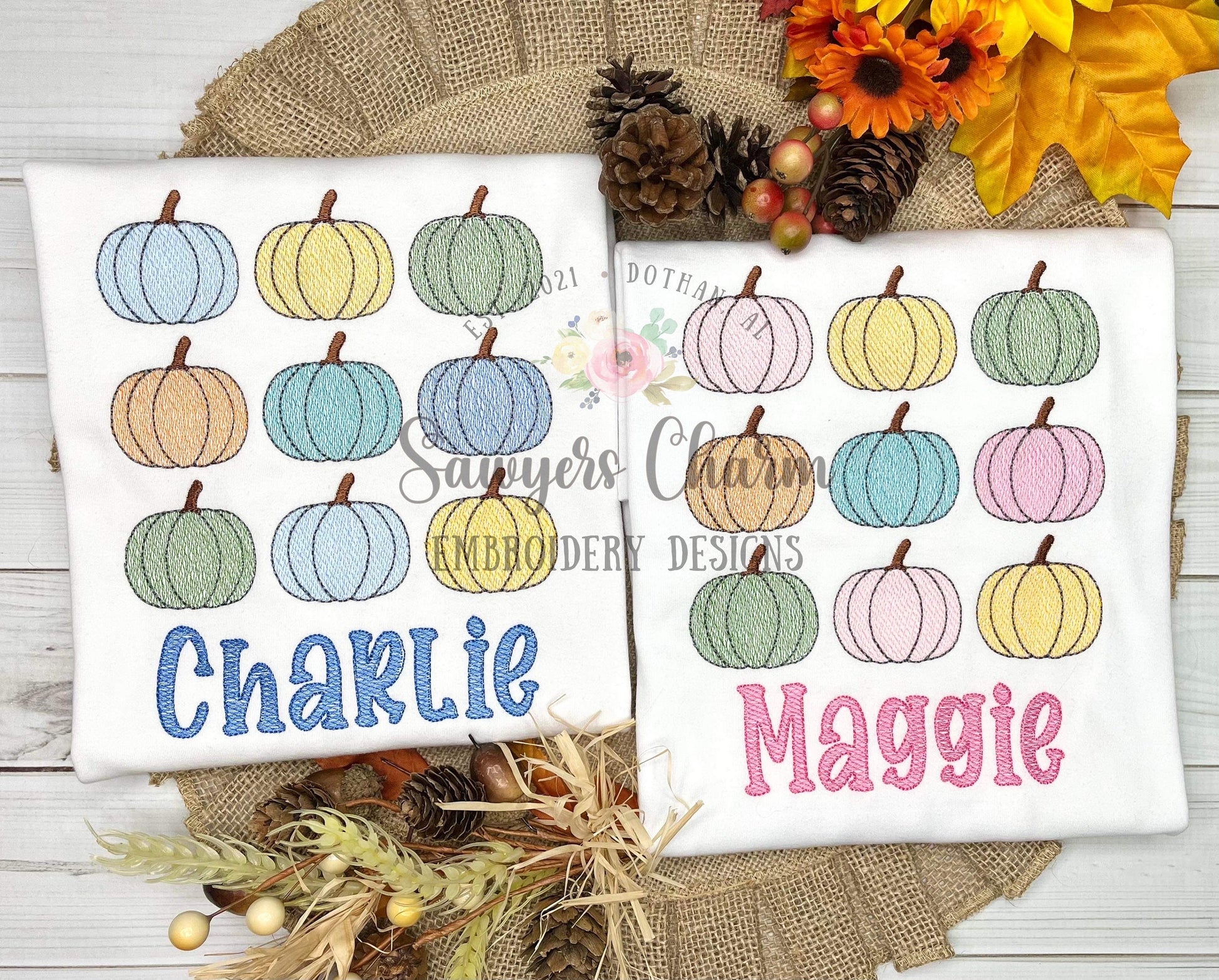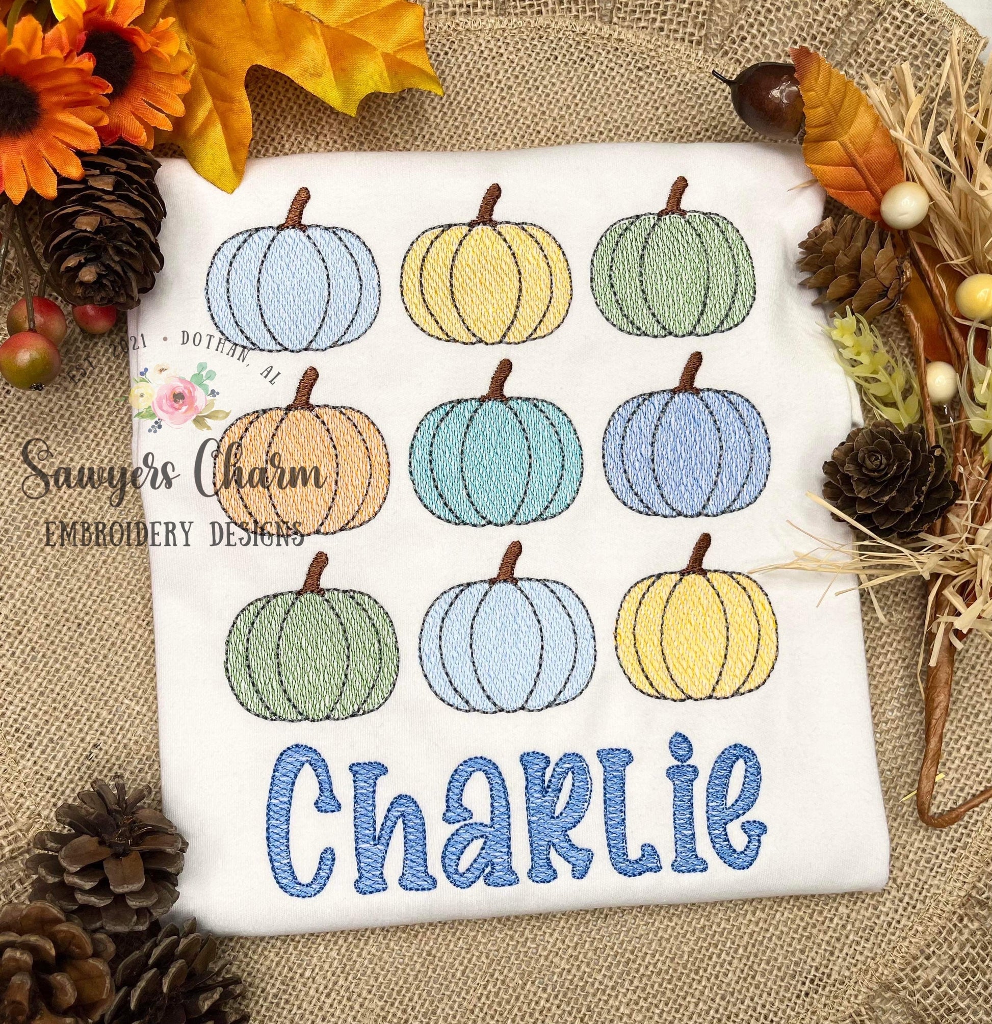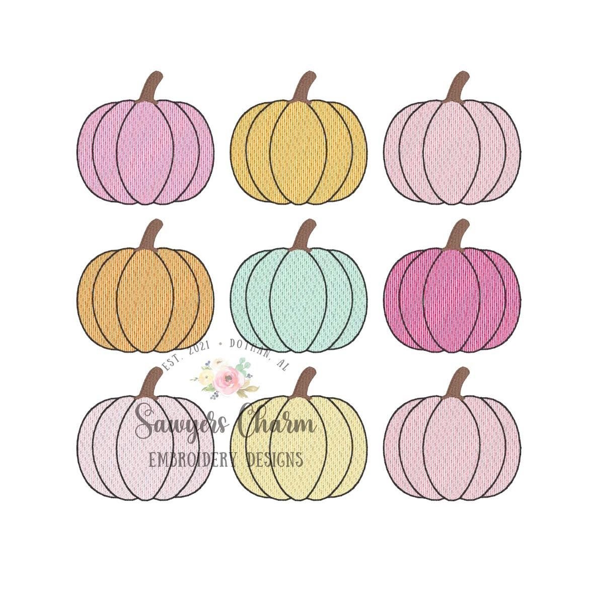 This embroidery file comes in 4 sizes.....4x4, 5x5, 6x6, and 8x8. This is a light fill sketch embroidery design....not fill and dense stitch. The outline of the pumpkins and the stems are done all in one step, but you have the option for each pumpkin to be a different color. :)