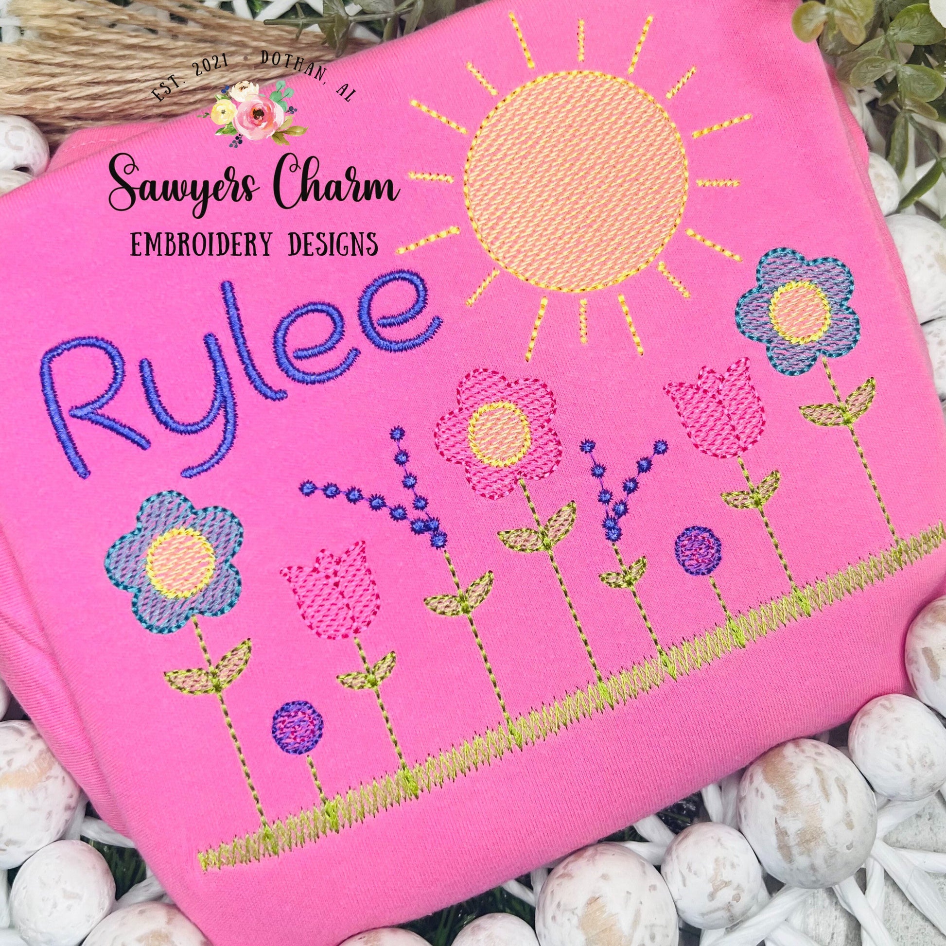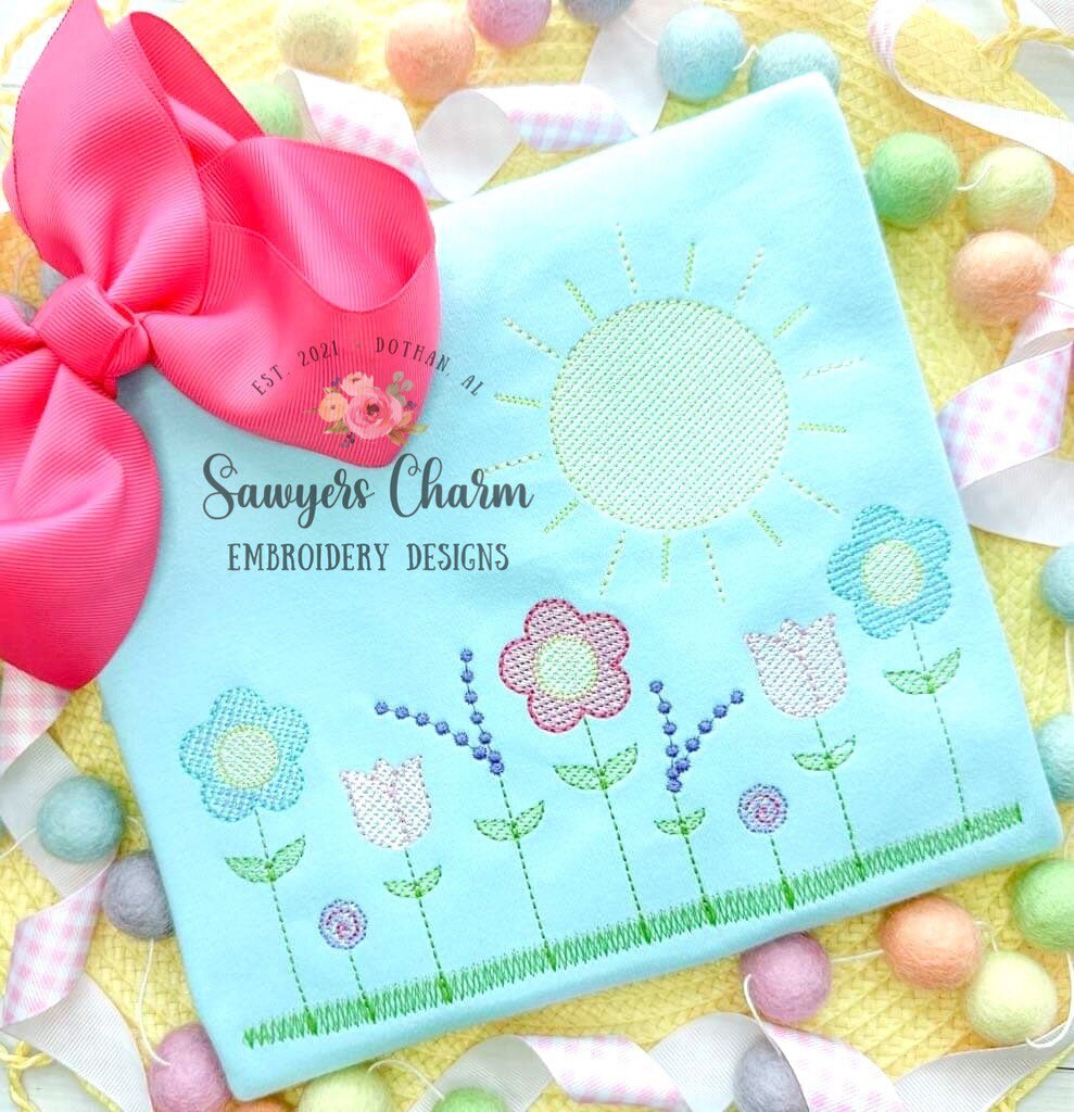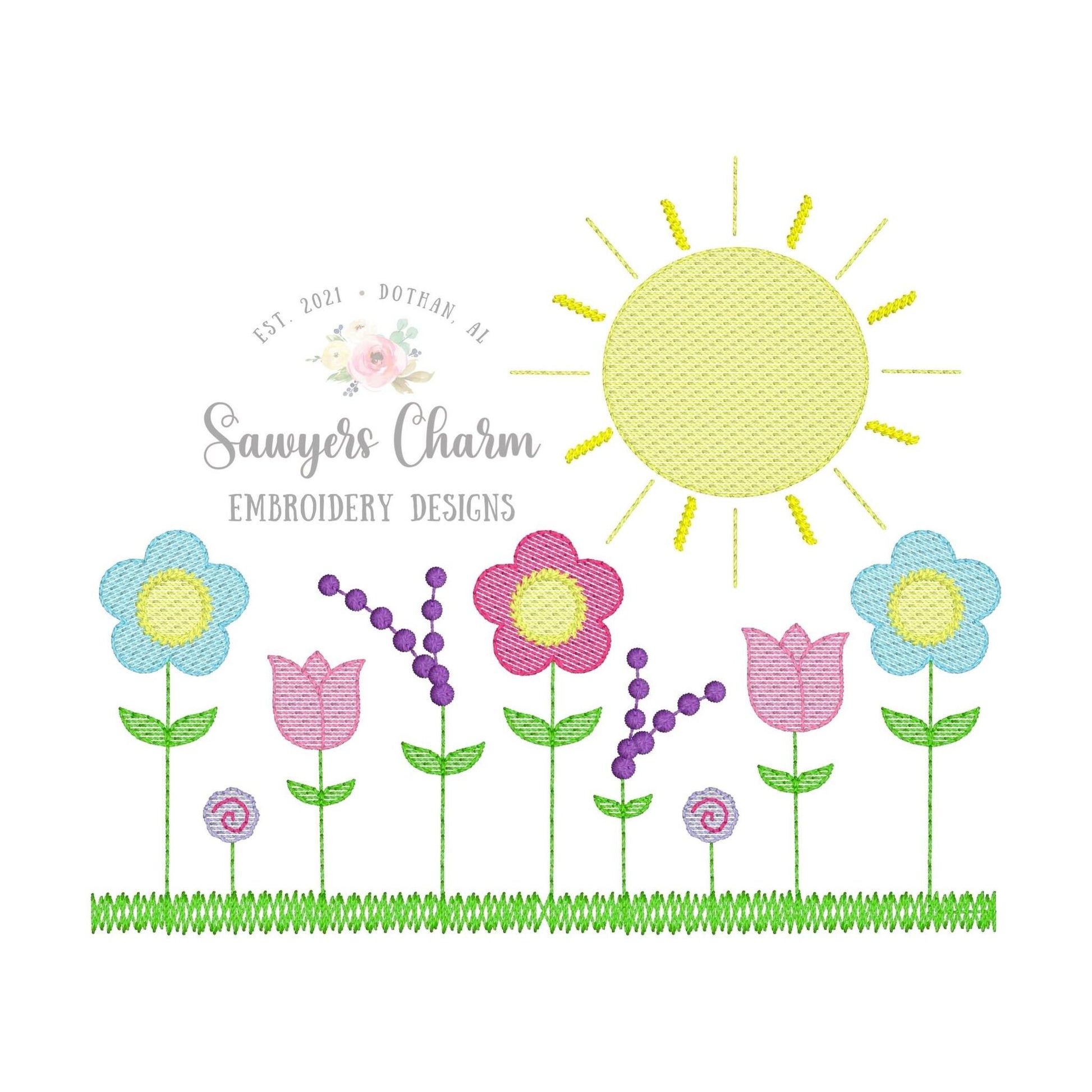 This embroidery file comes in 4 sizes....5 inch wide, 6 inch wide, 5x7, and 8x8. This is a light fill sketch stitch design with zig zag stitch grass. It has bean stitch finishing details. This is so sweet and such a quick stitch out. This is not a dense filled design. This designs has the sunshine with the flowers.