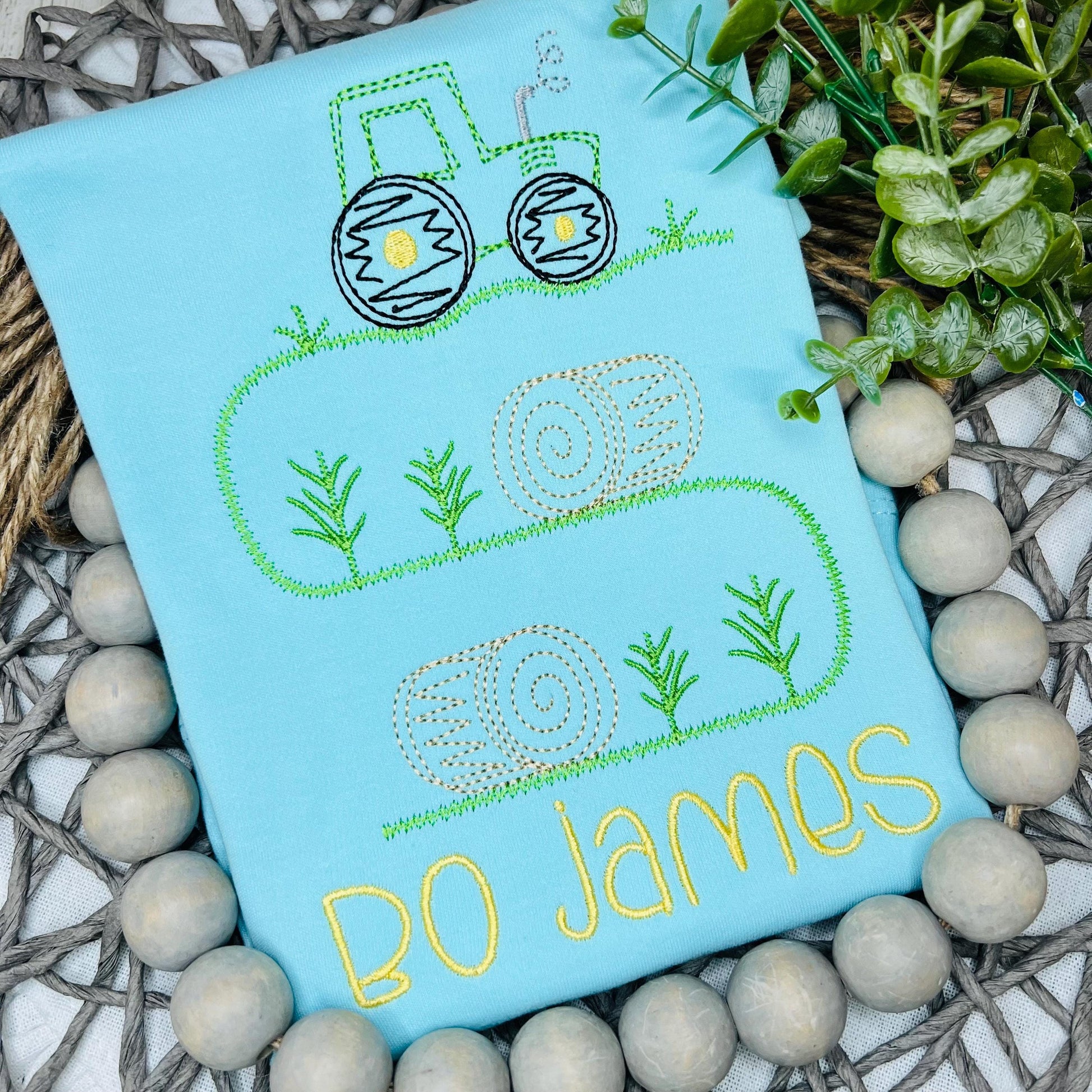 Squiggly Tractor hay bales trio bean stitch machine embroidery design file, quick stitch, farming, harvest, transportation, wheat, crops