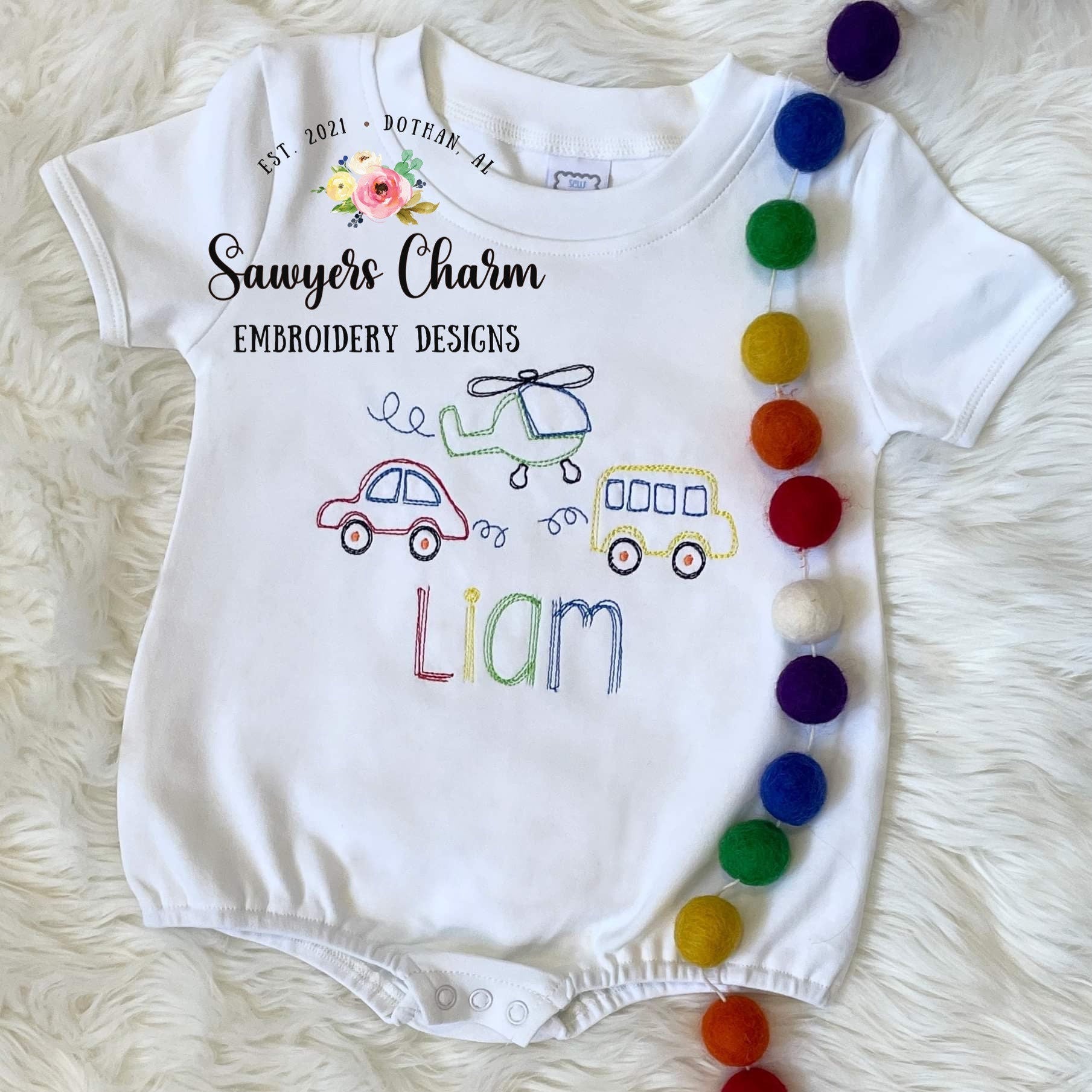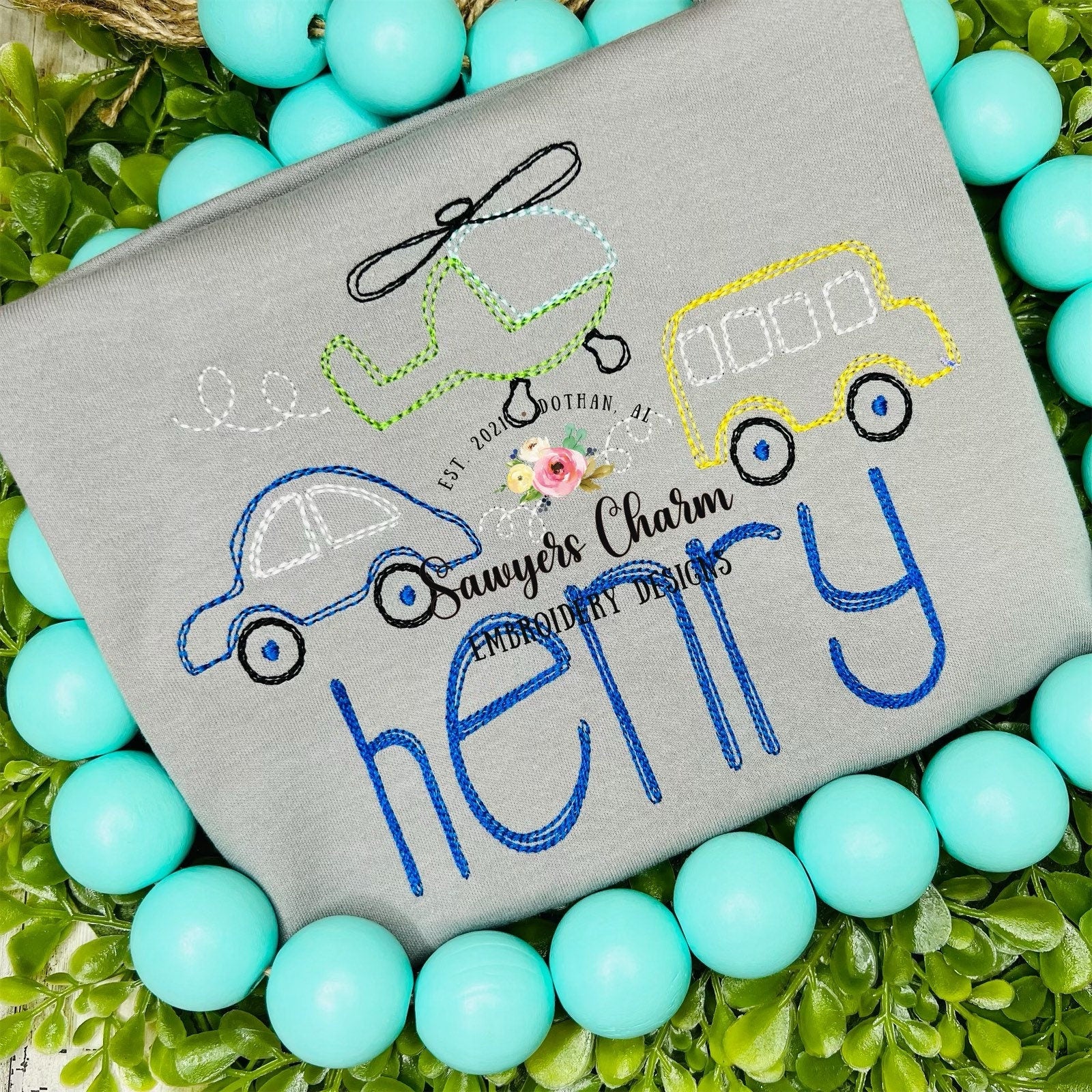 Squiggly transportation vehicles trio quick stitch, vintage style, bean stitch machine embroidery design file, car, bus, helicopter