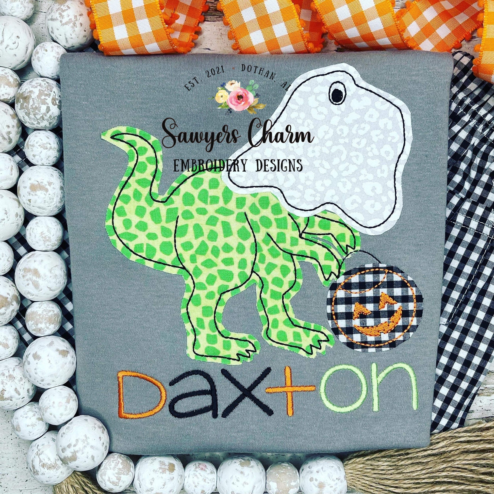 T-Rex ghost trick or treating bean stitch applique, machine embroidery design file, jackolantern pumpkin dinosaur dino, spooky, candy bucket