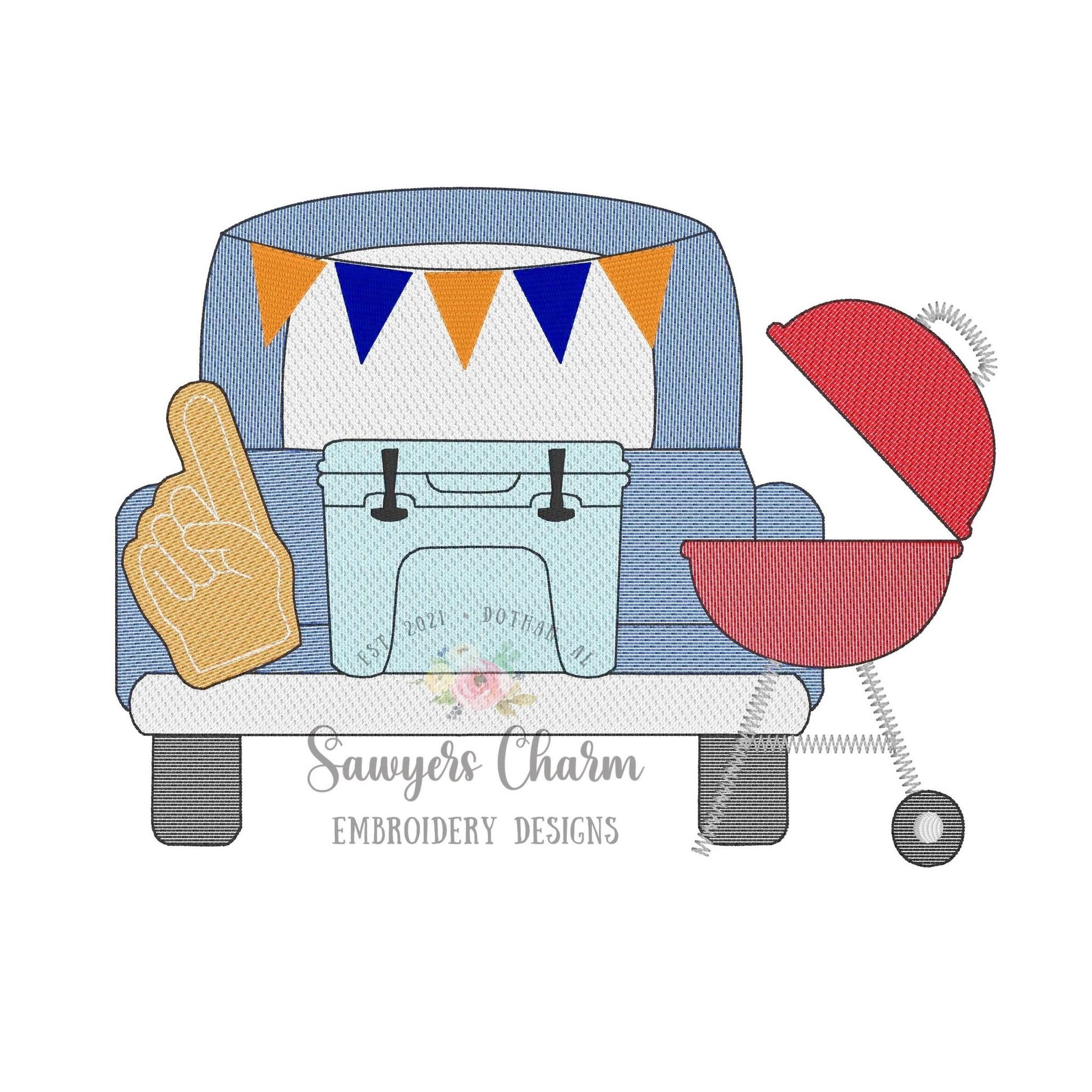 Tailgating vintage truck, foam finger, grill, cooler, bunting sketch stitch machine embroidery design file, sports, college school team