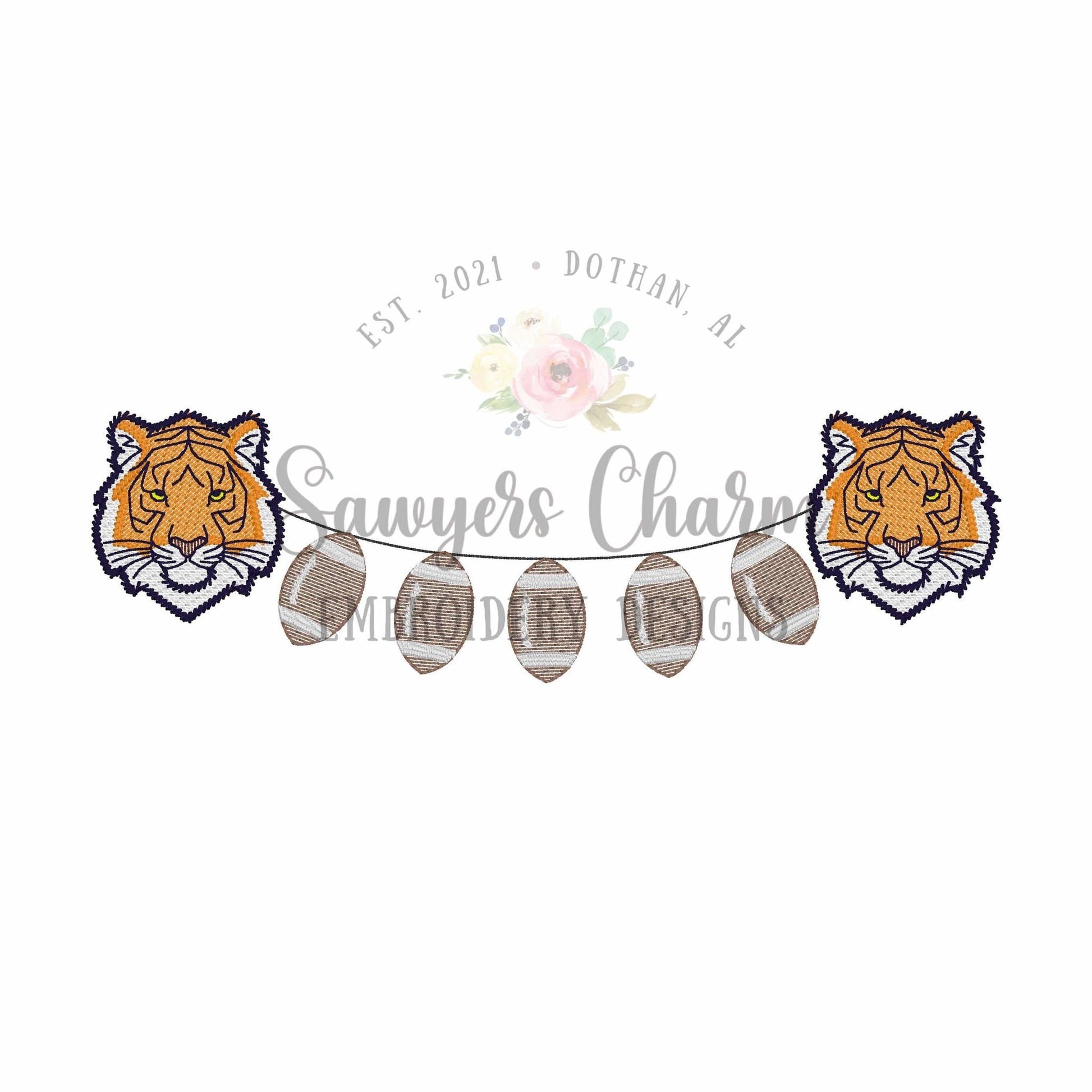 Tiger face & footballs bunting banner sketch stitch machine embroidery design, college university, fall sports fan, quick stitch
