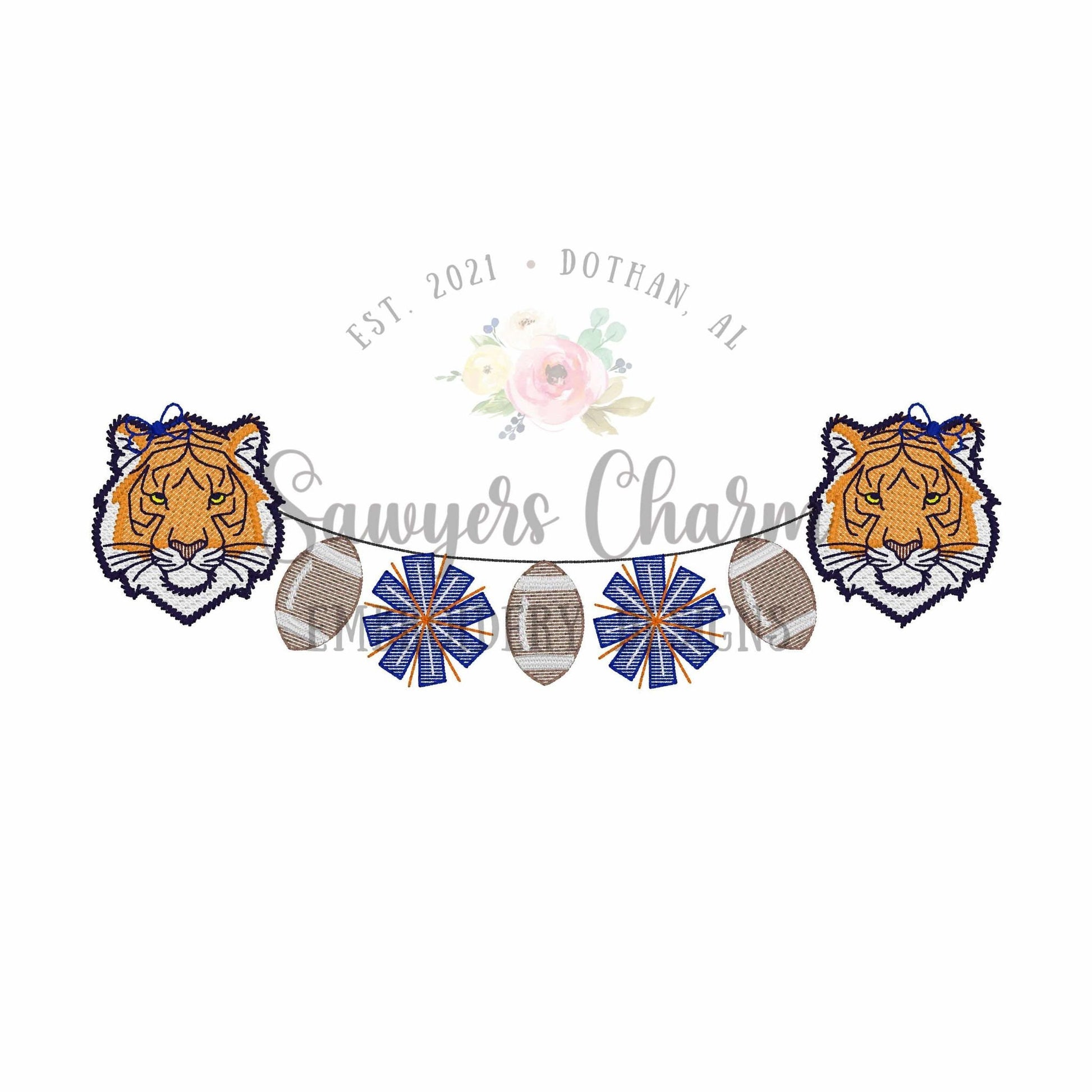 Tiger face & footballs/pom poms bunting banner sketch stitch machine embroidery design, college university, fall sports fan, cheerleading