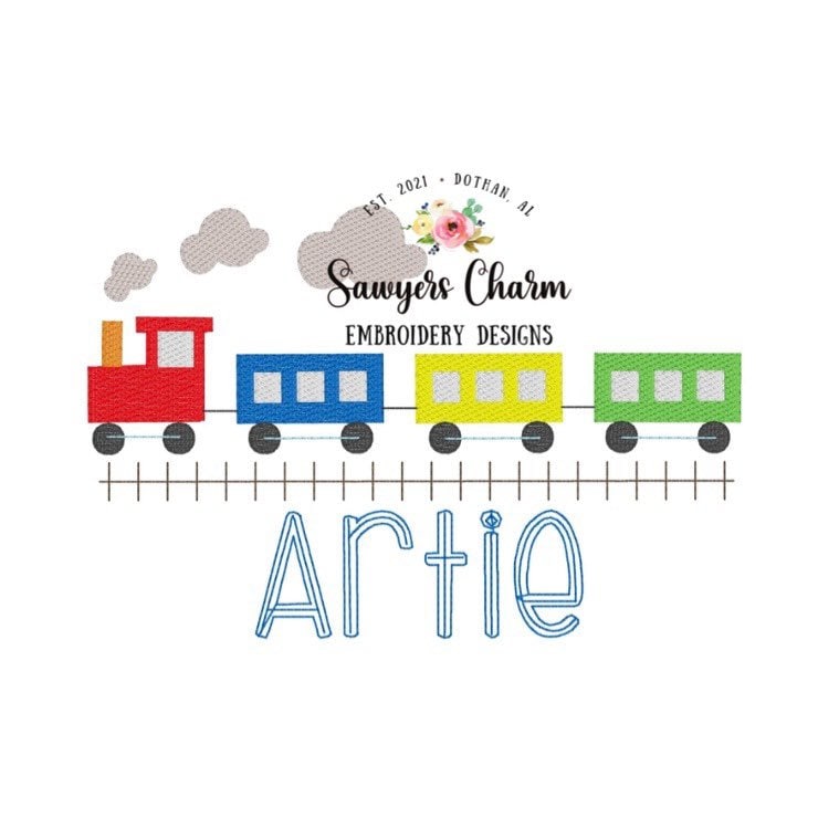 This embroidery file comes in 4 sizes....4x4, 5x3, 5x7, and 8x8. This design comes in sketch stitch. This will be perfect for both boys and girls depending on colors/fonts used. :) The 4x4 size has 3 train cars so that it fits better. The other 3 sizes have the 4 train cars.