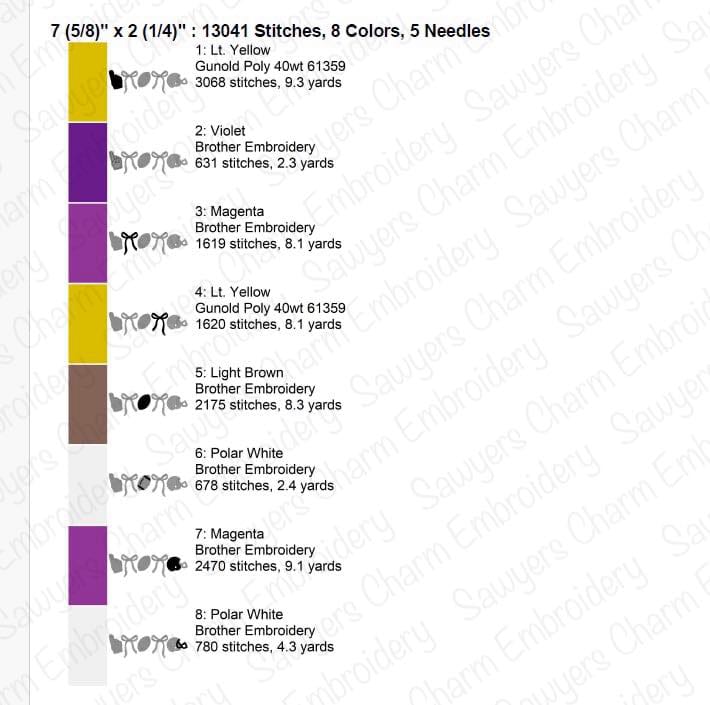 PLEASE NOTE: This design cannot be separated so that the bows and footballs can be stitched by themselves. What you see is what you will get to stitch. I put the same color steps together to help those with single needle machines not have to change threads as much. :)