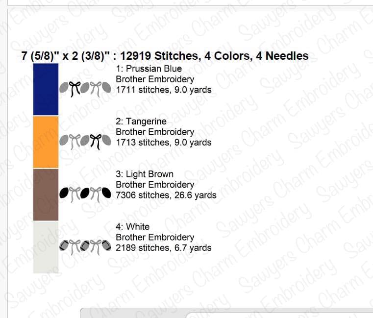 PLEASE NOTE: This design cannot be separated so that the bows and footballs can be stitched by themselves. What you see is what you will get to stitch. I put the same color steps together to help those with single needle machines not have to change threads as much. :)