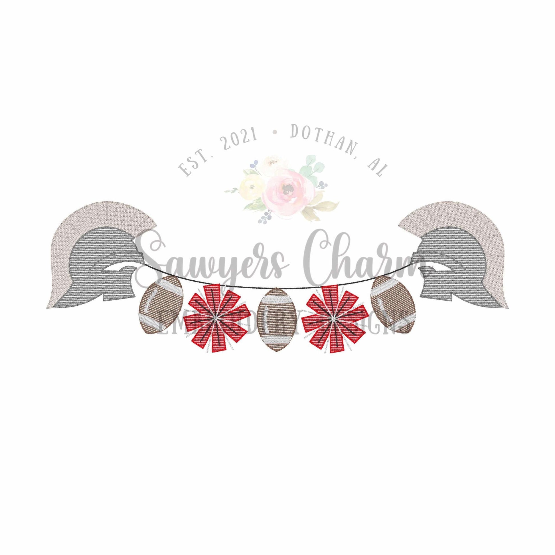 Trojans football/pom poms bunting banner, sketch stitch embroidery design, college university football cheerleader, mascot, knight, spartan