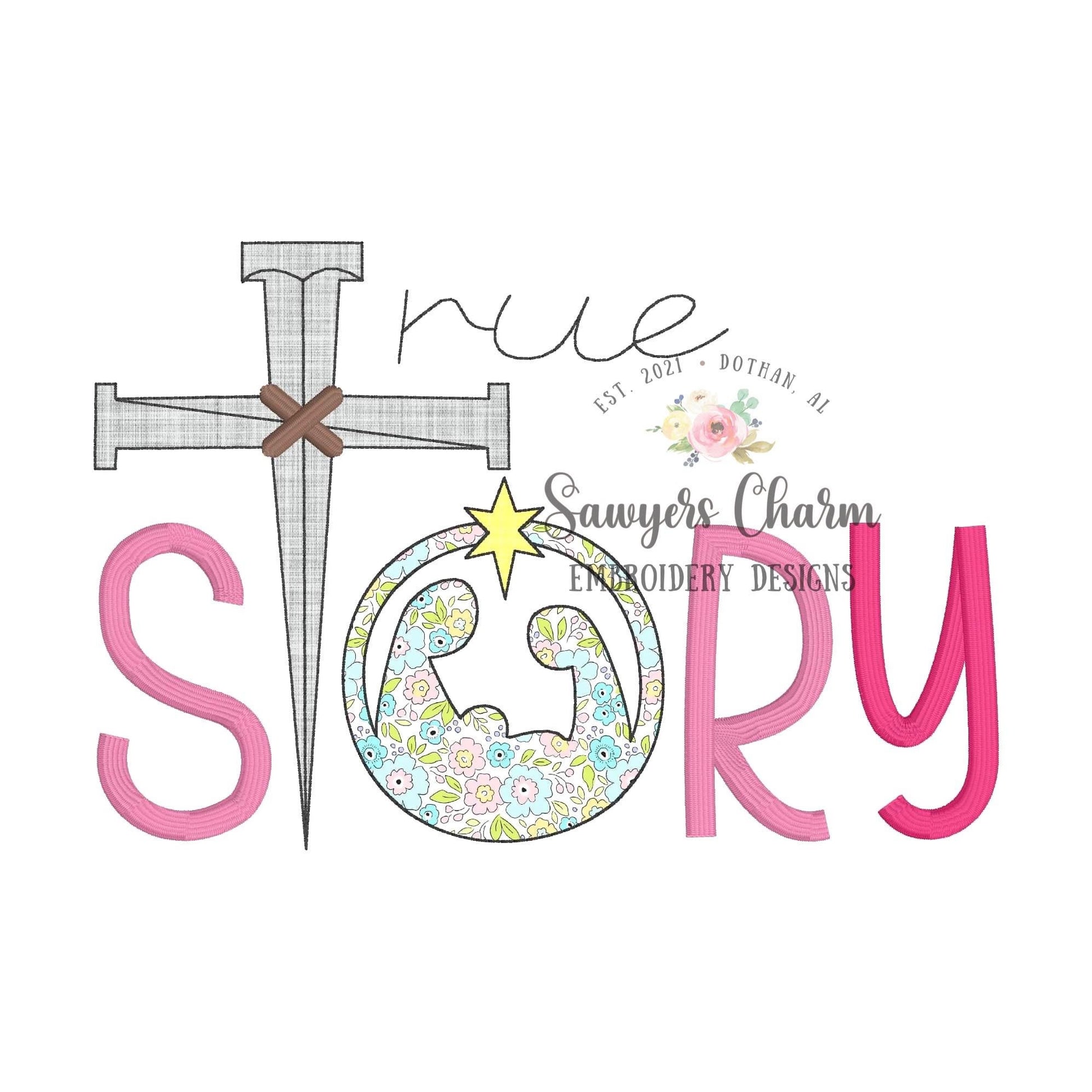 This embroidery file comes in 3 sizes.....6 inch wide, 5x7, and 8x8. This design has satin stitch letters for STORY and bean stitch letters for TRUE, with a bean stitch applique cross/nails and nativity/star. Perfect for boys or girls depending on colors used.