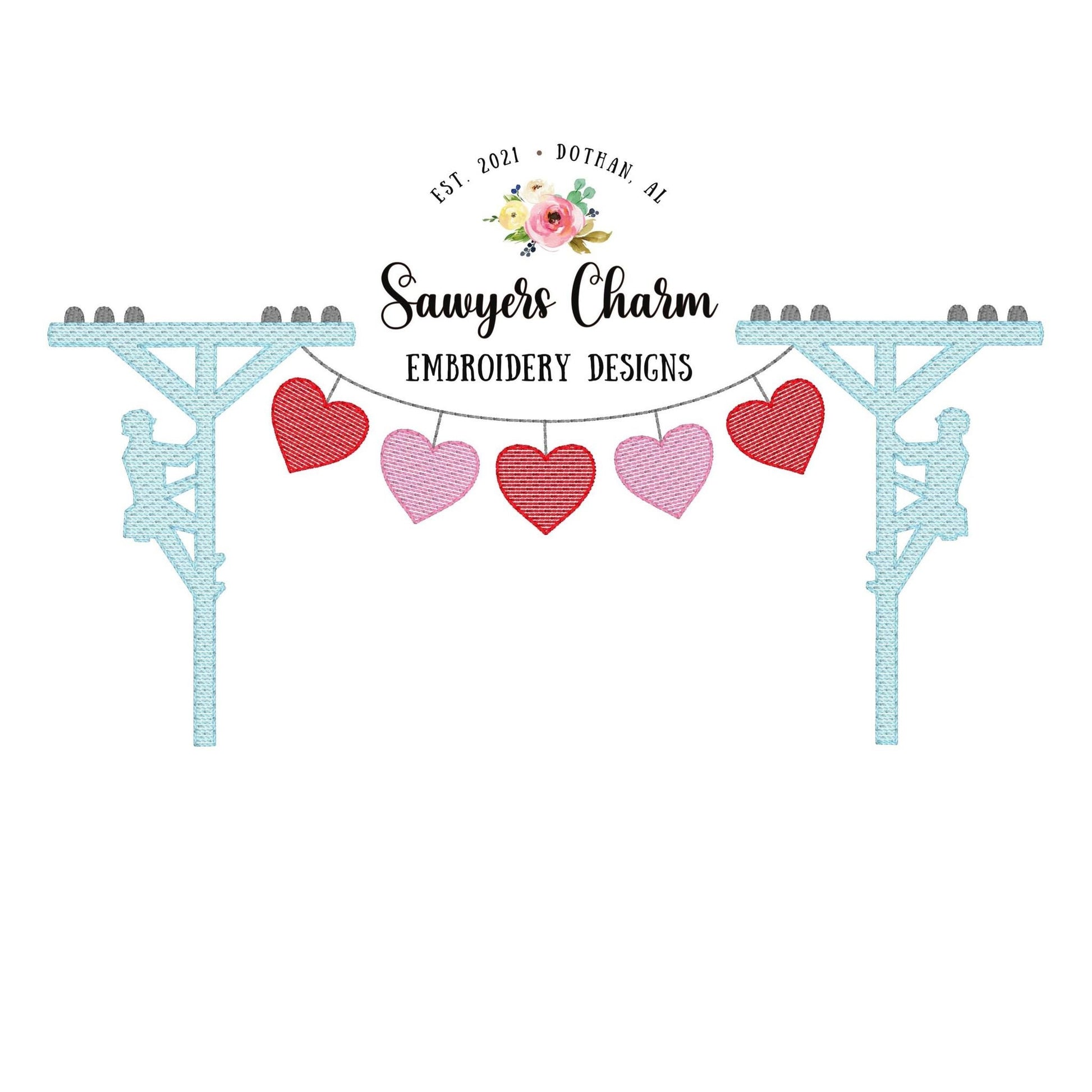 Valentine lineman hearts bunting banner, sketch stitch machine embroidery design file, quick stitch, bean stitch, love, XOXO