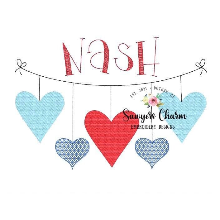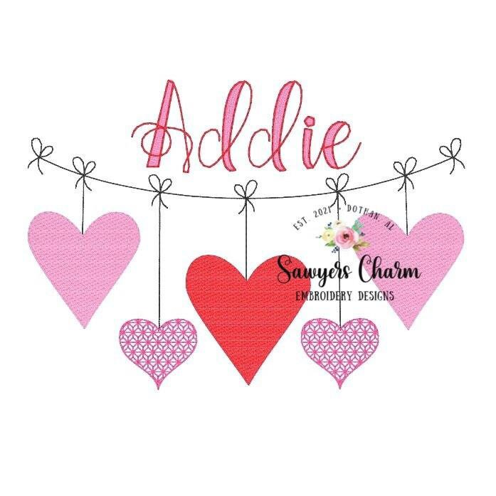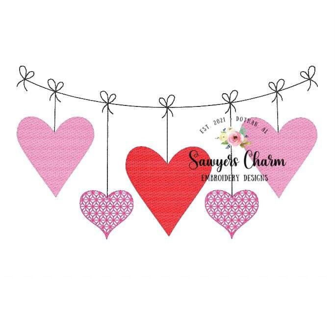 This embroidery file comes in 5 sizes....4x4, 5x3, 6 inch wide, 5x7, and 8x8. The hearts are a sketch stitch embroidery design with bean stitch details. The smaller hearts are a motif fill. You will get this design with the bows all along the string, and without the bows on the string (except the two on the ends). :)