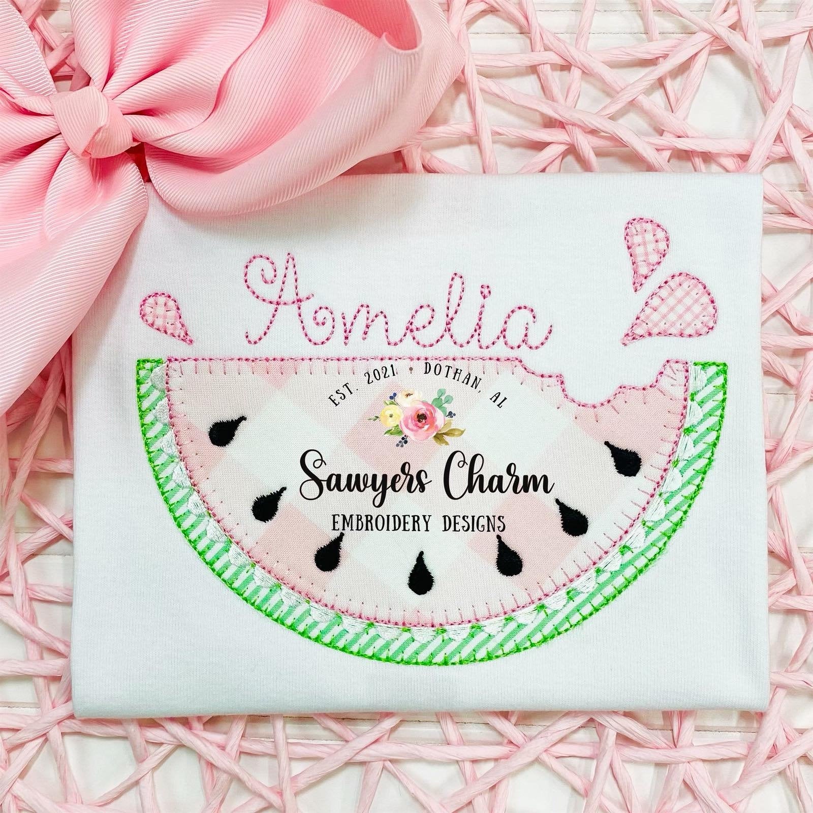 This embroidery file comes in two sizes.....will fit the 5 x 7 and 8 x 8 hoops. This is a blanket stitch watermelon design that will be perfect for those summer outfits. 5x7 design has approximately 6002 stitches, and 8 x 8 design has approximately 7136 stitches.