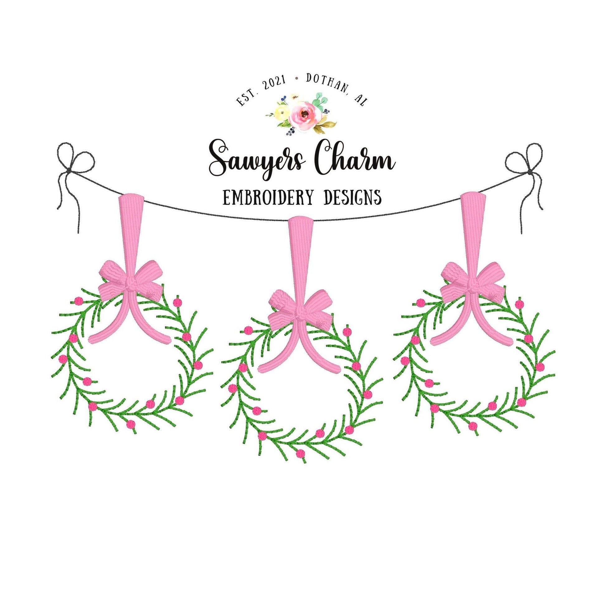 Wreath trio with bows bunting banner bean stitch, machine embroidery design file, satin stitch, holidays Christmas, floral winter wonderland